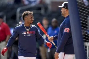 Atlanta Braves’ Ozzie Albies takes batting practice before a baseball game between the Atlanta Braves and the Philadelphia Phillies, Tuesday, April 8, 2025, in Atlanta. (AP Photo/Mike Stewart)